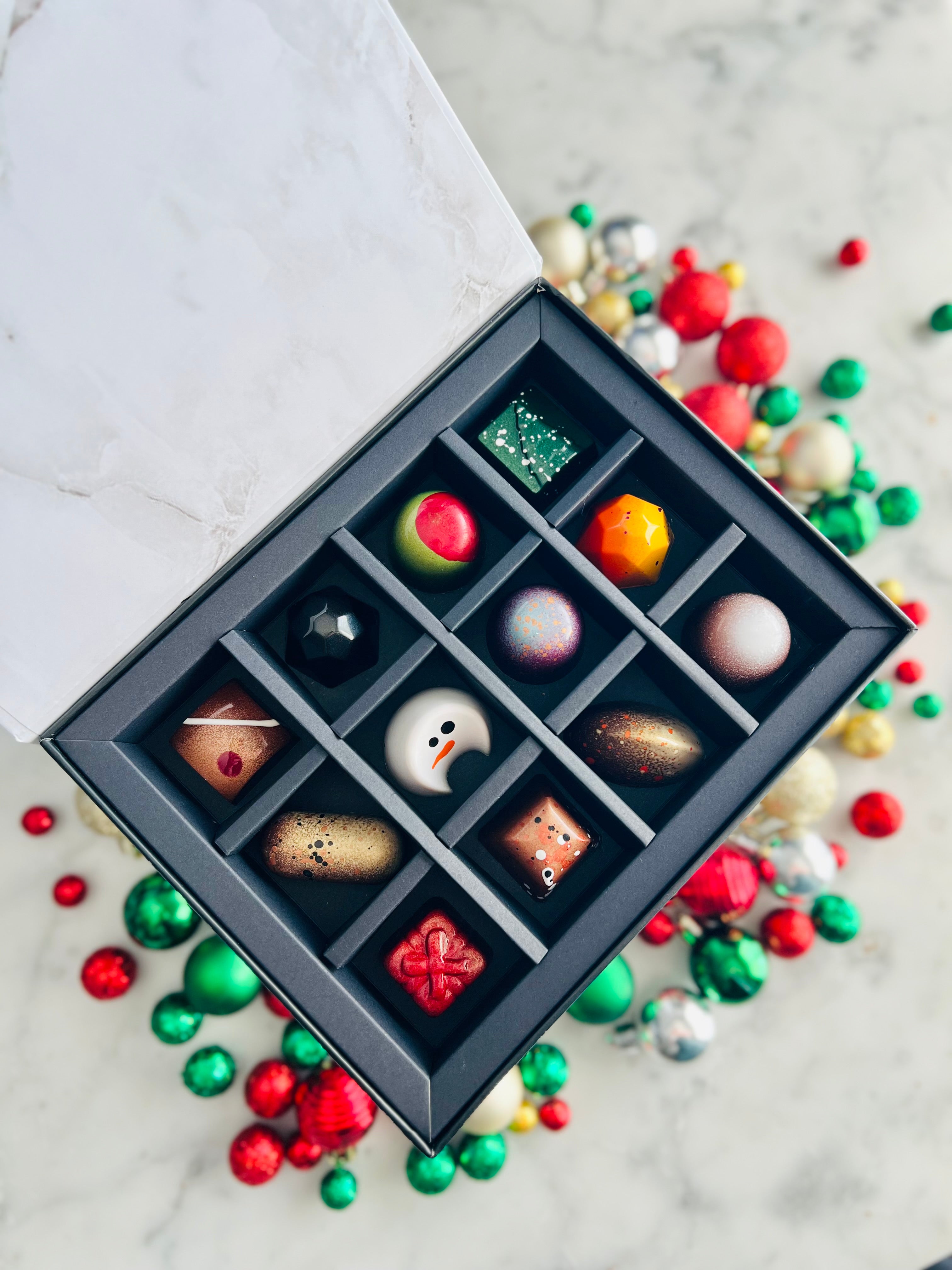 Experience our new collection of festive holiday Marble & Steel bonbons in one of our signature 12 piece gift boxes.